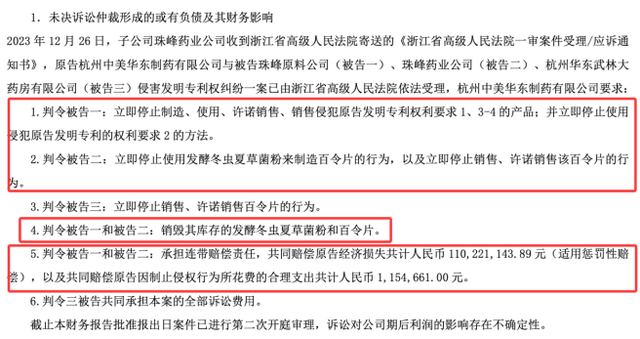 华东医药的反应是激烈的法律反击。2023年底,其以侵犯“发酵冬虫夏草菌粉”相关专利为由,将佐力药业告上法庭,索赔1.11亿元。这是一记典型的“专利阻击”,旨在从源头上扼杀挑战者的生产资格。