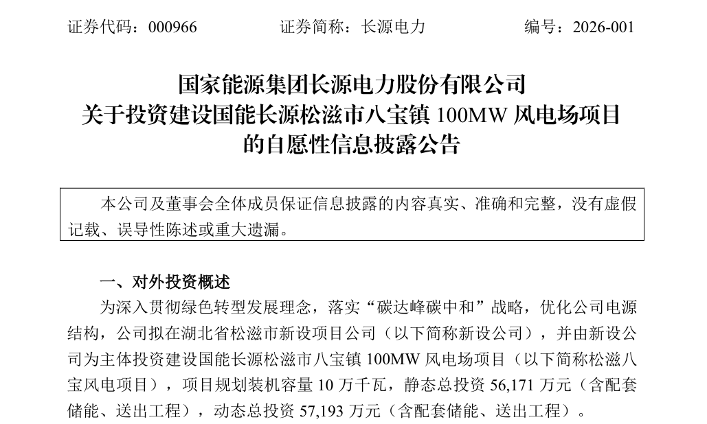 2026年1月4日晚间,国家能源集团长源电力股份有限公司(以下简称“长源电力”或“公司”)发布《关于投资建设国能长源松滋市八宝镇100MW风电场项目的自愿性信息披露公告》。