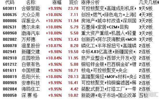 高位股方面,合锻智能9天5板,大众公用4天3板,深振业A、德尔未来、渤海汽车、万邦德3天2板,澄星股份等2连板。