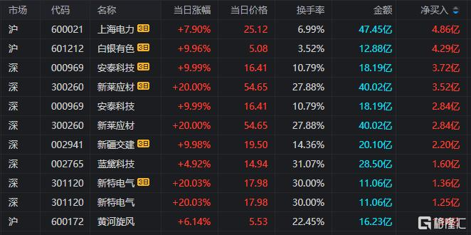 龙虎榜单日净买入额前三为安泰科技、新莱应材、蓝黛科技,分别为2.84亿元、2.84亿元、1.60亿元。