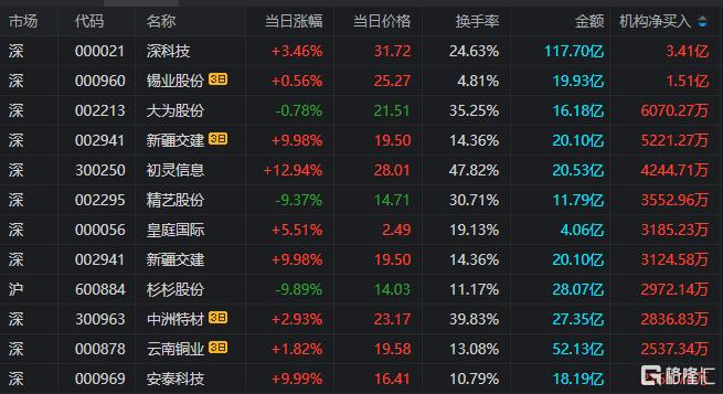 龙虎榜中涉及机构专用席位的个股中,当日净买入额前三为深科技、大为股份、初灵信息,分别为3.41亿元、6070.27万元、4244.71万元。