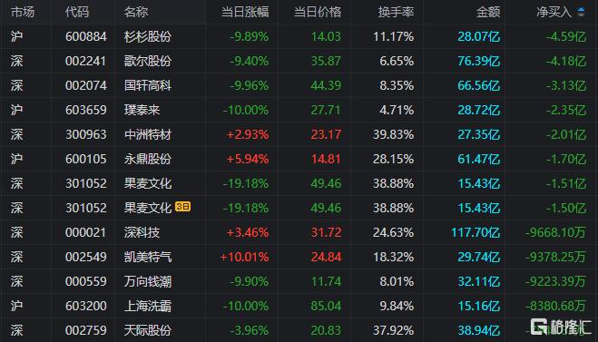 龙虎榜单日净卖出额前三为杉杉股份、歌尔股份、国轩高科,分别为4.59亿元、4.18亿元、3.13亿元。