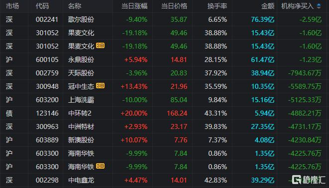龙虎榜中涉及机构专用席位的个股中,当日净卖出额前三为歌尔股份、果麦文化、永鼎股份,分别为2.59亿元、1.60亿元、1.23亿元。
