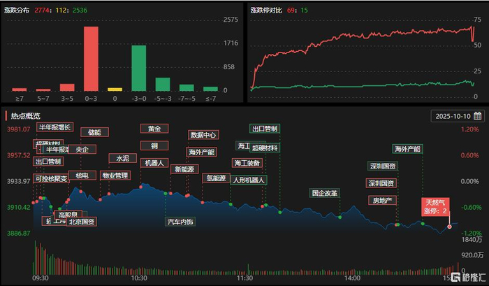 10月10日,沪深两市成交额2.52万亿,较上一个交易日缩量1376亿。板块方面,燃气、煤炭等板块涨幅居前,半导体、电池、贵金属等板块跌幅居前。