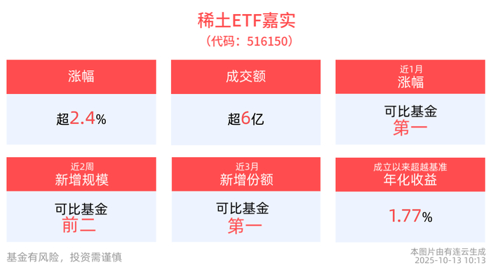 流动性方面,稀土ETF嘉实盘中换手8%,成交6.38亿元。拉长时间看,截至10月10日,稀土ETF嘉实近1周日均成交5.98亿元,排名可比基金第一。