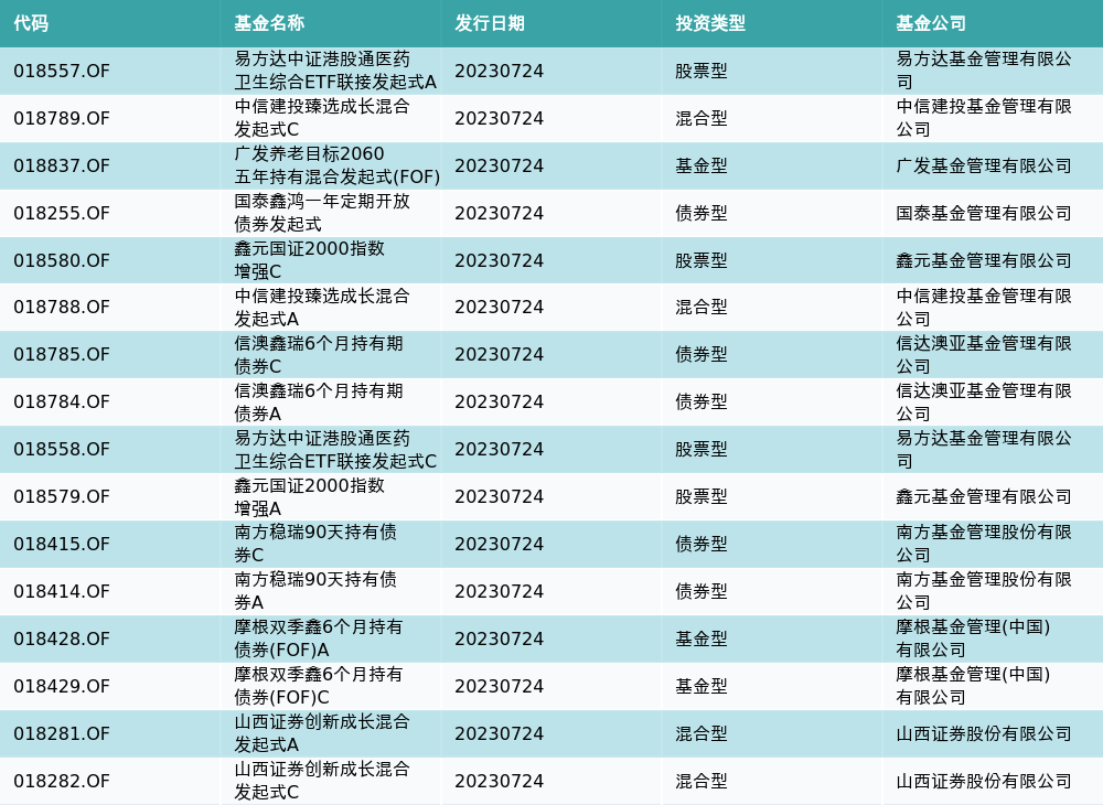 7月24日有16只新基金发行,分别为:易方达中证港股通医药卫生综合ETF联接发起式A、中信建投臻选成长混合发起式C、广发养老目标2060五年持有混合发起式(FOF)、国泰鑫鸿一年定期开放债券发起式、鑫元国证2000指数增强C、中信建投臻选成长混合发起式A、信澳鑫瑞6个月持有期债券C、信澳鑫瑞6个月持有期债券A、易方达中证港股通医药卫生综合ETF联接发起式C、鑫元国证2000指数增强A、南方稳瑞90天持有债券C、南方稳瑞90天持有债券A、摩根双季鑫6个月持有债券(FOF)A、摩根双季鑫6个月持有债券(FOF)C、山西证券创新成长混合发起式A、山西证券创新成长混合发起式C,详情见下表: