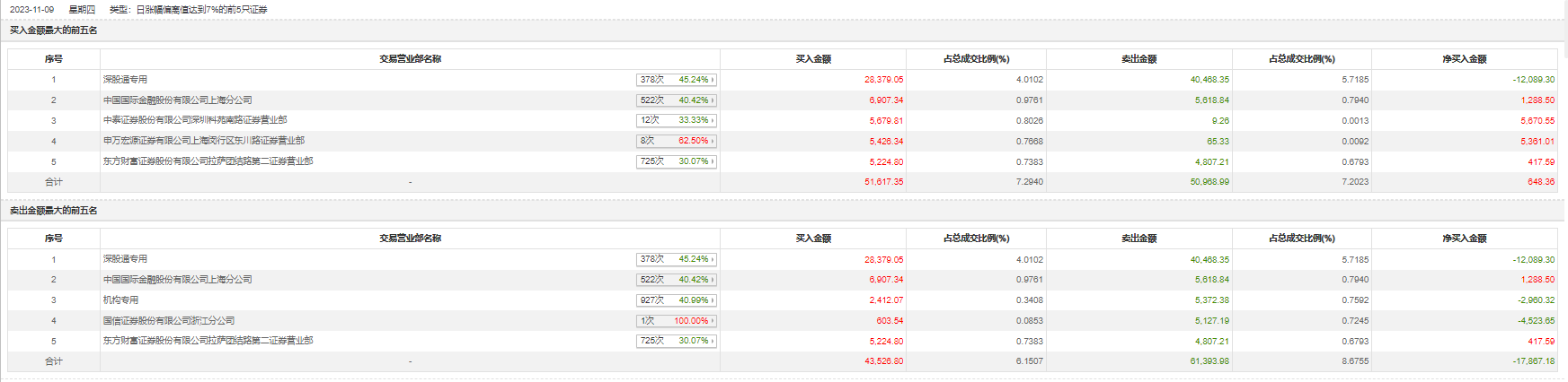 今日涨停,成交额70.77亿元,换手率14.43%,盘后龙虎榜数据显示,深股通专用席位买入2.84亿元并卖出4.05亿元,一机构专用席位净卖出2960.32万元。