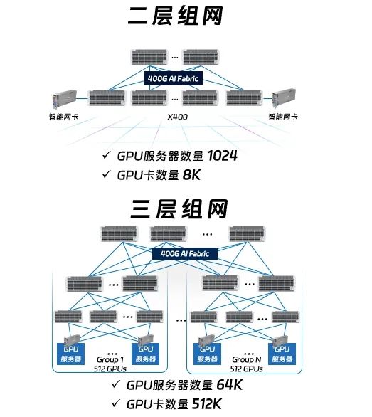 在算力资源灵活拓展方面,X400超级AI以太网在超高的端口密度以及弹性可拓展的能力加持下,具备超高性能的同时,可以满足数十万卡级别的算力规模,在二层组网下,GPU服务器数量可达1024台,支持8K张GPU卡,可根据算力规模灵活拓展到三层组网,GPU服务器规模可达64000台,最大支持GPU卡的数量可以达到512K张,满足各种规模的组网要求,灵活的弹性组网成为业务创新的强大助力。