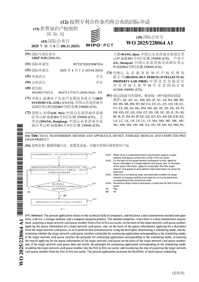 浪潮信息公布国际专利申请:“数据传输方法、装置及设备、存储介质和计算机程序产品”