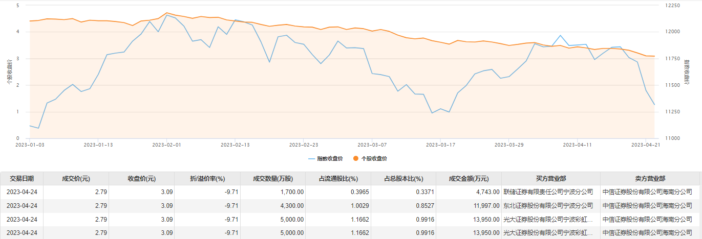 今日出现4.46亿元折价大宗交易,成交价2.79元/股(今日收盘价3.09元)。买方为