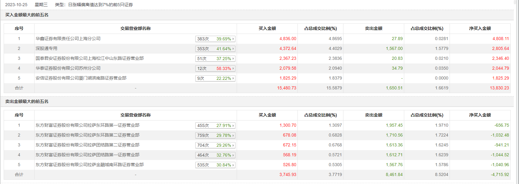 10月25日,众泰汽车今日涨停,全天换手率达6.45%,振幅达9.64%。龙虎榜数据显示,营业部席位合计净买入9114.31万元。其中,华鑫证券上海分公司、深股通专用分别买入4836.00万元、4372.64万元;东方财富证券拉萨东环路第一证券营业部、东方财富证券拉萨东环路第二证券营业部分别卖出1957.45万元、1710.56万元。