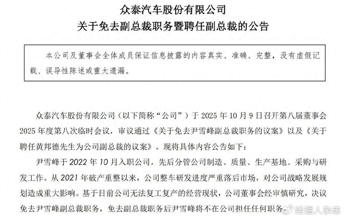 众泰汽车在公告中称:“尹雪峰原定任期已于2025年2月16日届满。从2021年破产重整以来,公司整车研发进度严重落后市场,对公司战略发展规划造成重大影响。基于目前公司无法复工复产的经营现状,公司董事会经审慎研究,决议免去尹雪峰副总裁职务,免去副总裁职务后尹雪峰将不在公司担任任何职务。”