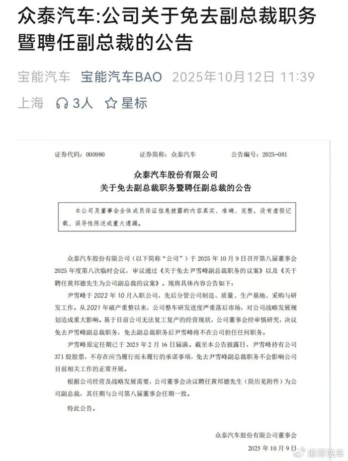 10月9日,众泰汽车发布重要人事变动公告,免去尹雪峰副总裁职务。公告中这句话,似乎也饱含深意——
