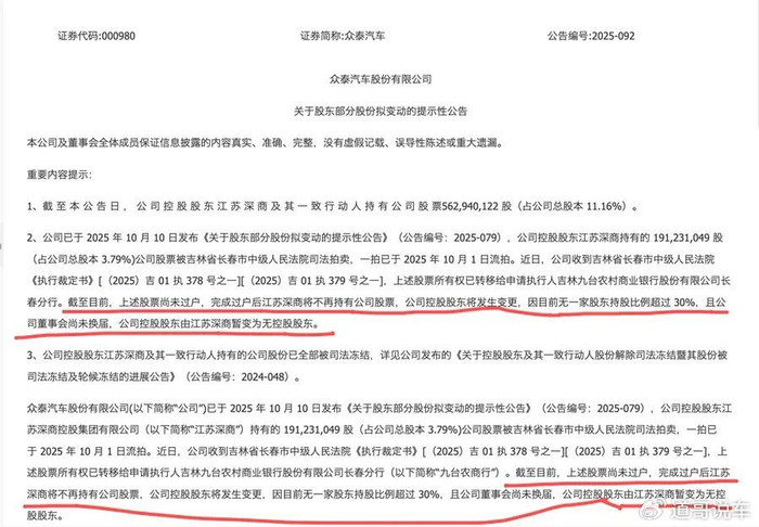 10月15日晚,众泰汽车发布“关于股东部分股份拟变动的提示性公告”。据公告内容,众泰汽车控股股东江苏深商持有的1.91亿股(占公司总股本3.79%)公司股票被吉林省长春市中级人民法院司法拍卖,一拍已于2025年10月1日流拍。