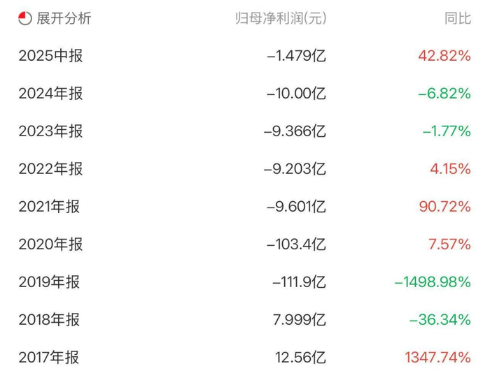 数据显示,2019年至2025上半年,众泰汽车分别亏损111.9亿元、103.4亿元、9.60亿元、9.20亿元、9.37亿元、10亿元、1.48亿元。
