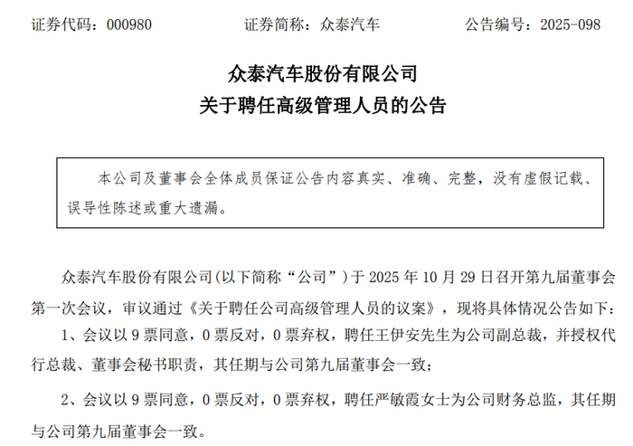 同日董事会上,《关于聘任公司高级管理人员的议案》同样全票通过,王伊安被聘任为众泰汽车公司副总裁,授权代行总裁、董事会秘书职责;严敏霞被聘任为公司财务总监,二者任期均与公司第九届董事会一致。
