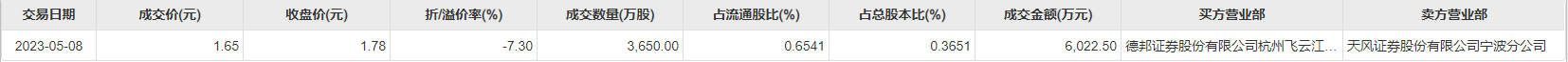 5月8日大宗交易成交3650万股,成交额6022.5万元,占当日总成交额的28.81%,成交价1.65元,较市场收盘价1.78元折价7.3%。