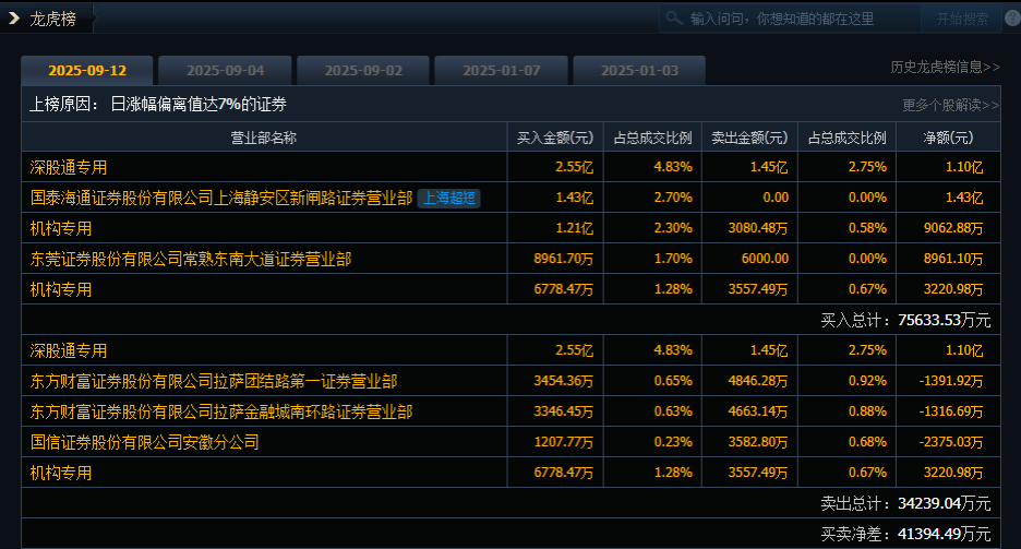 山子高科(000981)今日涨停,成交额52.79亿元,换手率20.50%,盘后龙虎榜数据显示,深股通专用席位买入2.55亿元并卖出1.45亿元,2家机构专用席位净买入1.23亿元。