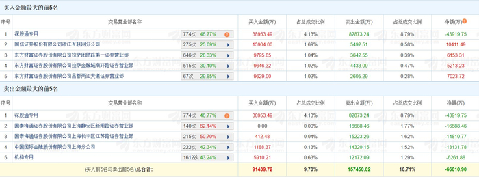 龙虎榜丨山子高科跌6.54%,深股通净卖出4.39亿元