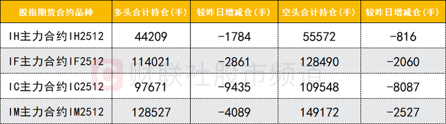 四大期指主力合约中,IH、IF、IC、IM合约多空双方均减仓,IM合约多头减仓数量较多。