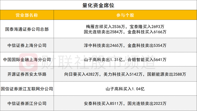 量化资金活跃度有所降低,山子高科遭中金上海分公司席位卖出1.31亿。