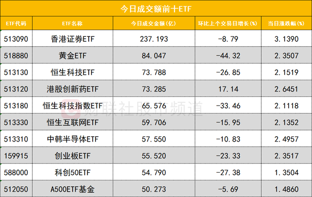 从成交额前十的ETF来看,香港证券ETF(513090)成交额位居首位,黄金ETF(518880)成交额位居次席。