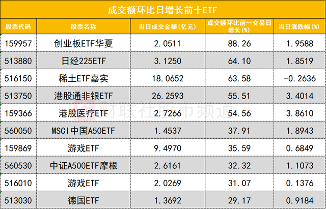 从成交额环比增长前十的ETF来看,创业板ETF华夏(159957)成交额环比增长88%位居首位;日经225ETF(513880)成交额环比增长64%位居次席。