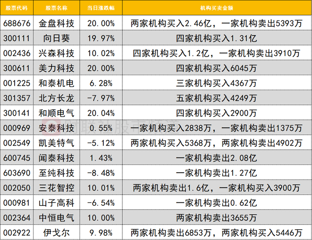 今日龙虎榜机构活跃度有所降低,买入方面,向日葵获四家机构买入1.31亿。兴森科技获四家机构买入1.2亿,同时遭一家机构卖出3910万。
