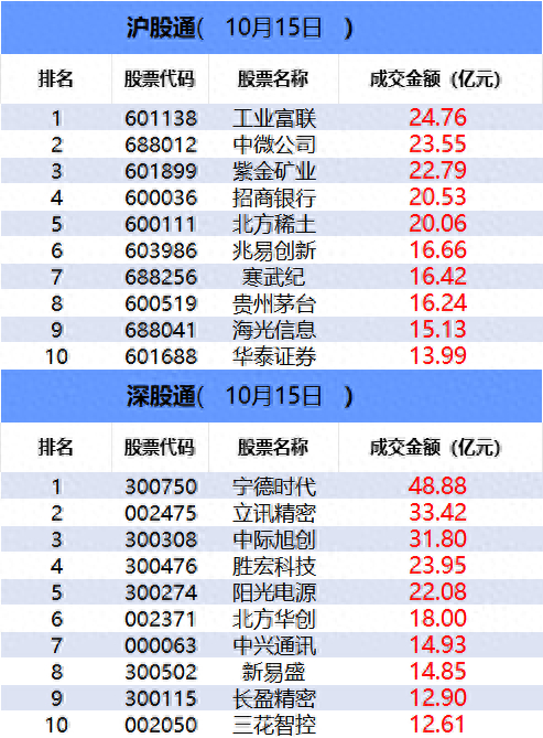 从沪股通前十大成交个股来看,工业富联位居首位;中微公司和紫金矿业分居二、三位。