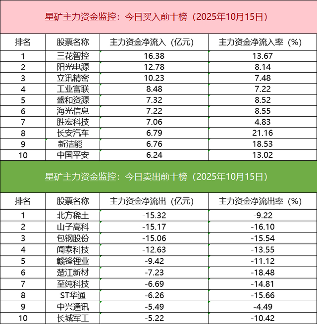 主力资金流出前十的个股所属板块较为分散,北方稀土净流出居首。
