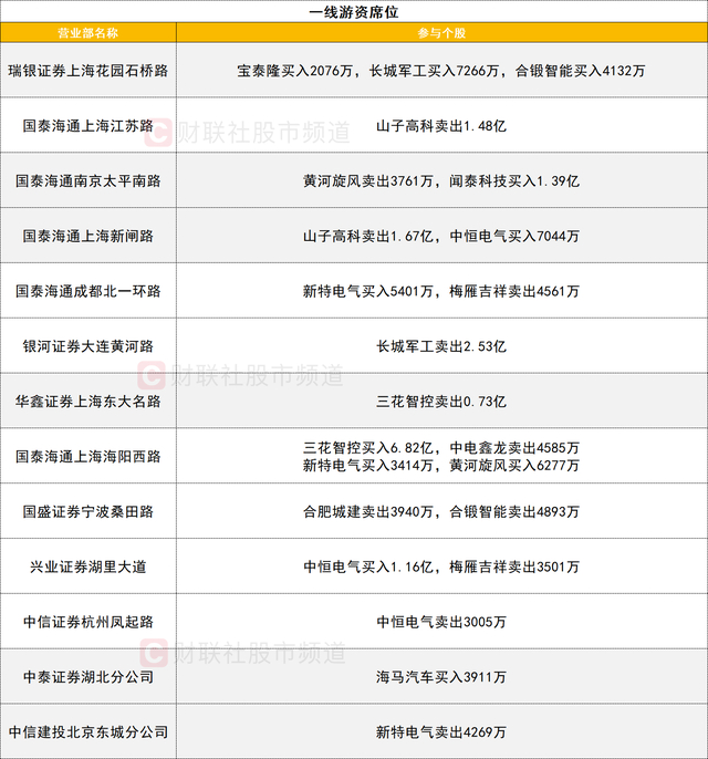 一线游资活跃度较高,三花智控获一家一线游资(国泰海通证券上海海阳西路)买入6.82亿,同时获深股通席位买入4055万。山子高科遭两家一线游资(国泰海通证券上海新闸路和国泰海通证券上海江苏路)分别卖出1.67亿和1.48亿。长城军工获一家一线游资买入7266万,同时遭一家一线游资卖出2.53亿。