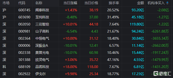 龙虎榜中涉及机构专用席位的个股中,当日净卖出额前三为闻泰科技、至纯科技、三花智控,分别为2.08亿元、1.27亿元、1.22亿元。