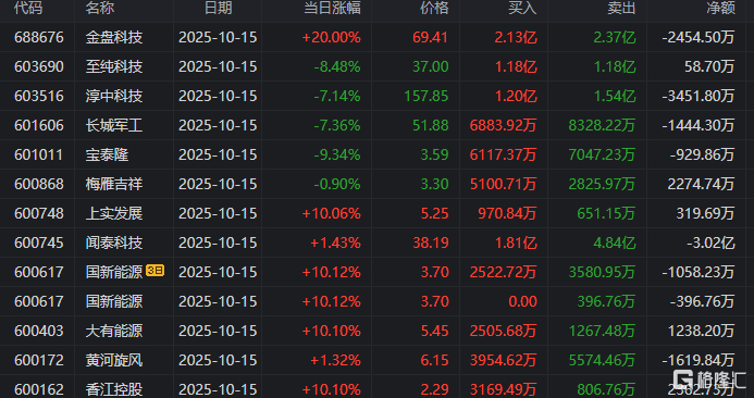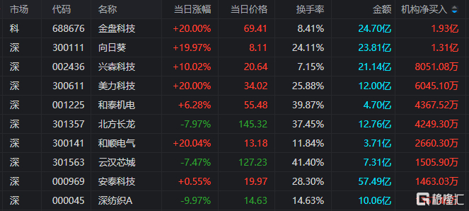 龙虎榜中涉及机构专用席位的个股中,当日净买入额前三为金盘科技、向日葵、兴森科技,分别为1.93亿元、1.31亿元、8051.08万元。