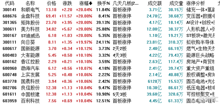焦点股方面,上海微电子概念股华建集团9天5板,零售板块国光连锁3连板,低价股大有能源4天3板、渤海汽车6天3板,可控核聚变概念股中国核建5天3板。