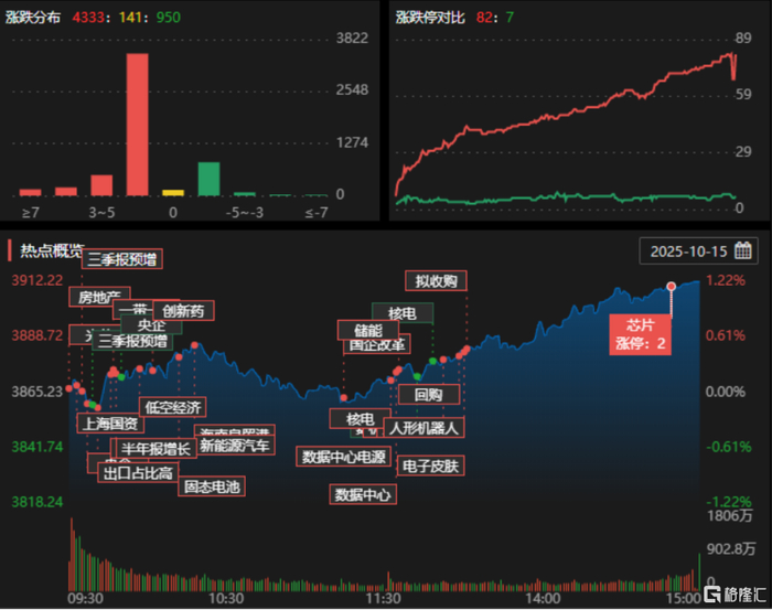 10月15日,沪指涨1.22%重回3900点,深成指涨1.73%,创业板指涨2.36%。沪深两市成交额2.07万亿,较上一个交易日缩量5034亿。汽车、电网设备、医药等板块涨幅靠前,港口航运、光刻机、转基因等下跌。