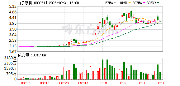 二级市场上,截至10月31日收盘,山子高科跌2.86%,报4.08元/股,总市值407.9亿元。2025年以来,山子高科股价涨幅达104%。