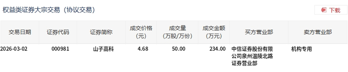 3月2日,山子高科大宗交易成交50万股,成交额234万元,占当日总成交额的0.07%,成交价4.68元,较市场收盘价4.68元持平。