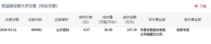 山子高科今日大宗交易平价成交30万股,成交额137.1万元