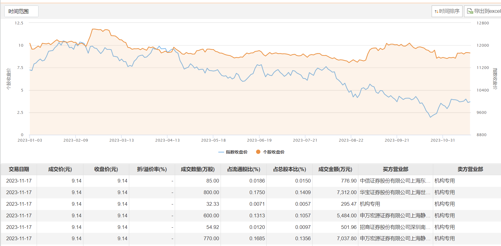 今日大宗交易成交2342.25万股,成交额2.14亿元,占当日总成交额的18.55%,成交价9.14元,较市场收盘价持平。