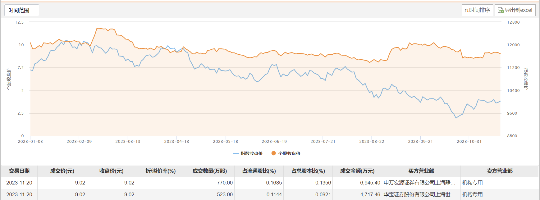 今日大宗交易成交1293万股,成交额1.17亿元,占当日总成交额的16.16%,成交价9.02元,较市场收盘价持平。