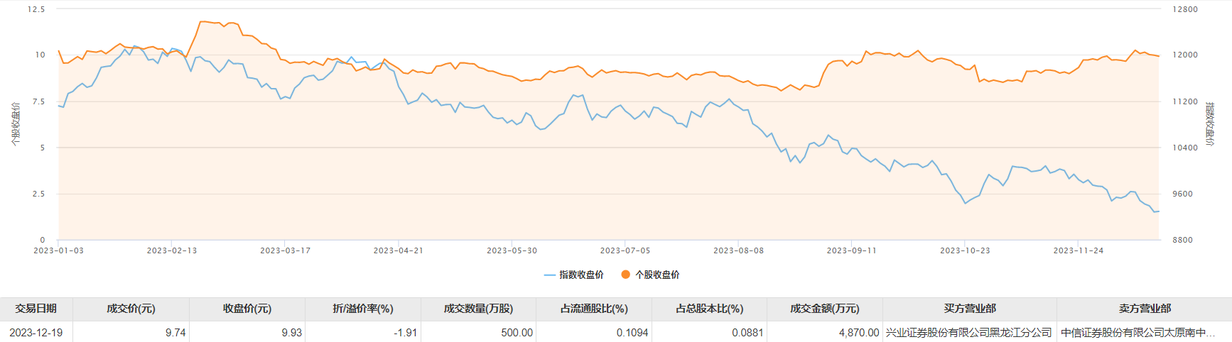 12月19日大宗交易成交500万股,成交额4870万元,占当日总成交额的16.07%,成交价9.74元,较市场收盘价折价1.91%。