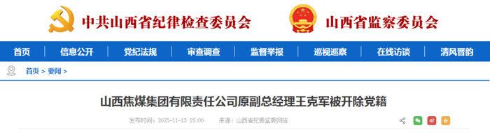 11月13日,山西省纪委监委发布消息,经山西省委批准,对山西焦煤集团有限责任公司原副总经理王克军严重违纪违法问题进行了立案审查调查,决定给予王克军开除党籍处分,按规定取消其享受的待遇,收缴其违纪违法所得,将其涉嫌犯罪问题移送检察机关依法审查起诉。
