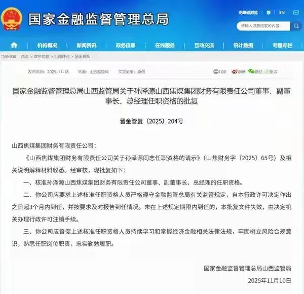 国家金融监督管理总局山西监管局于2025年11月10日正式批复,核准孙泽源山西焦煤集团财务有限责任公司董事、副董事长、总经理的任职资格。批复要求,孙泽源需在批复作出之日起3个月内到任,并按要求及时报告到任情况。