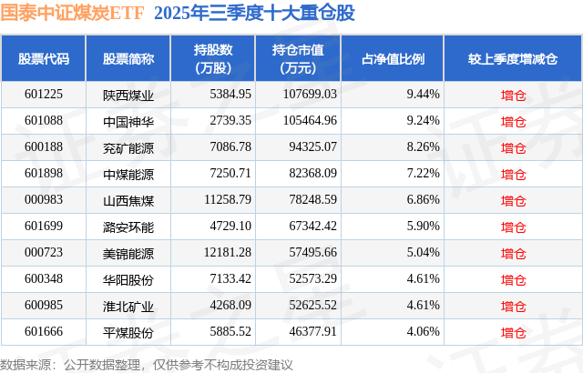 国泰中证煤炭ETF的前十大重仓股如下: