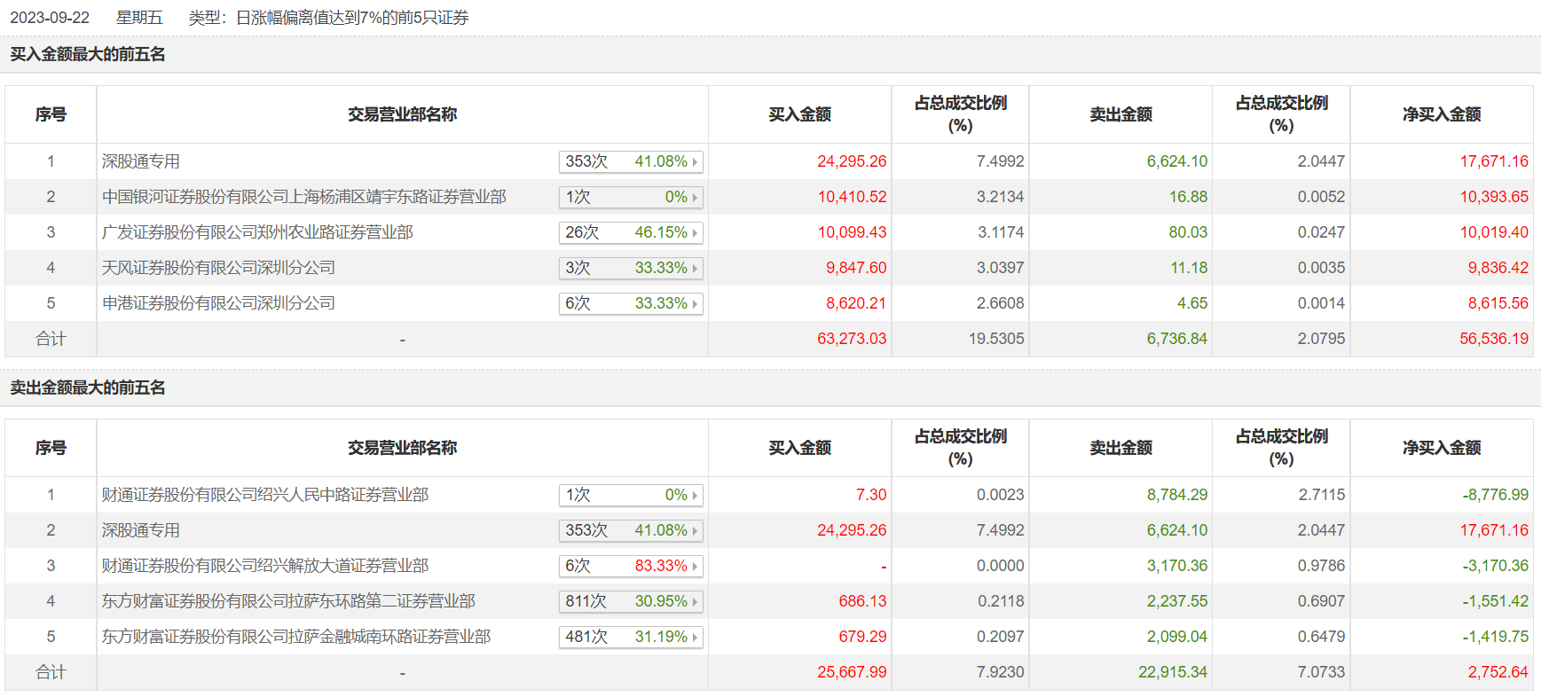 具体来看,深股通专用、中国银河证券上海杨浦区靖宇东路证券营业部分别买入2.43亿元、1.04亿元;财通证券绍兴人民中路证券营业部、深股通专用分别卖出8784.29万元、6624.10万元。