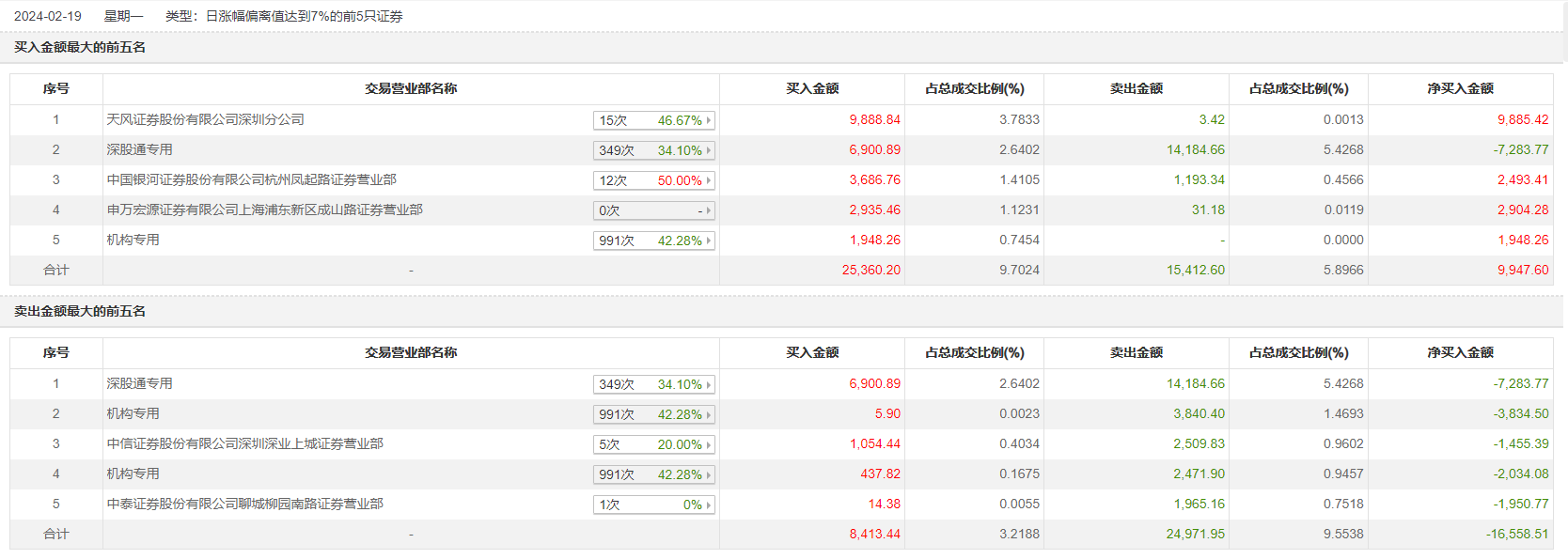 具体来看,机构买入2391.98万元,卖出6312.3万元,合计净卖出3920.32万元。此外,天风证券深圳分公司、深股通专用分别买入9888.84万元、6900.89万元;深股通专用、中信证券深圳深业上城证券营业部分别卖出1.42亿元、2509.83万元。