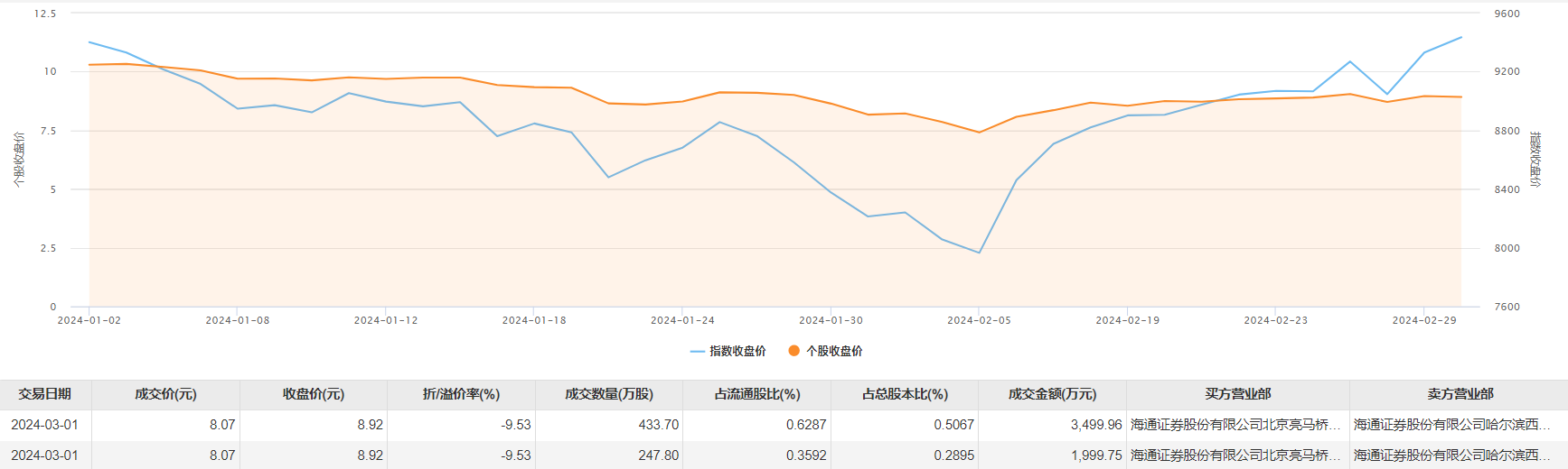 3月1日大宗交易成交681.5万股,成交额5499.71万元,占当日总成交额的43%,成交价8.07元,较市场收盘价8.92元折价9.53%。