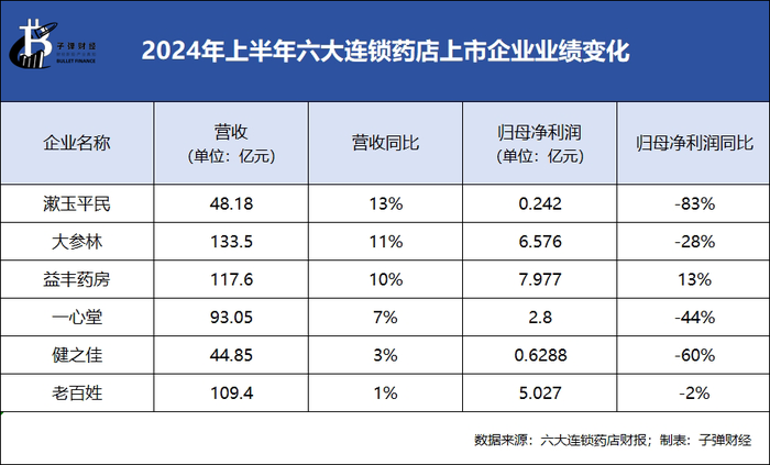 今年上半年,益丰药房实现了营收、净利润双增长,在六家连锁药店上市企业中,益丰药房以117.6亿元营收、7.98亿元的归母净利润排名第一。漱玉平民、一心堂、健之佳、老百姓、大参林则增收不增利。