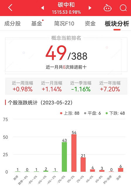 中国经济网北京5月22日讯 今日,碳中和板块整体涨幅0.98%,其中,88只股票上涨,6只股票平盘,48只股票下跌。