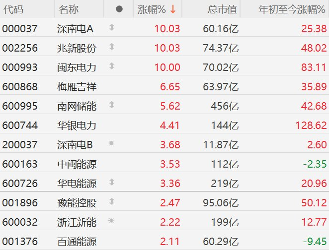 格隆汇11月10日|A股市场电力股走强,其中,深南电A、兆新股份、闽东电力涨停,梅雁吉祥涨超6%,南网储能涨超5%,华银电力涨超4%,中闽能源、华电能源涨超3%。